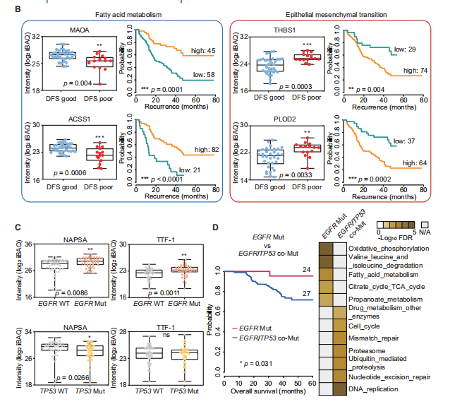 研究者收集了103份肺腺癌患者样本,通过蛋白组学和磷酸化蛋白组学分析,共识别出了11,119个蛋白和22,564个磷酸化位点(图1)。其中,上皮间质转化(EMT)和炎症及癌变信号通路可能会导致1期肺腺癌患者预后不良。