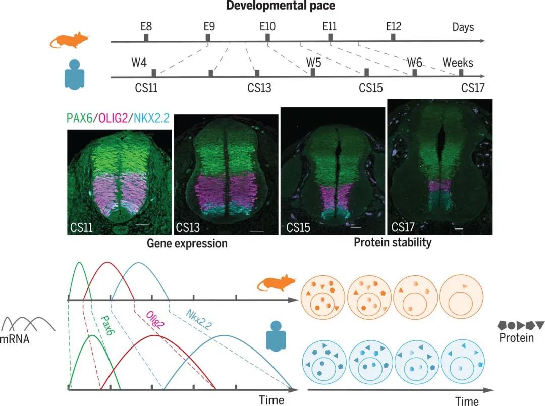 所有哺乳动物都遵循相同的步骤从胚胎生长到成年,这其中涉及相似的基因和分子信号,以相同的顺序进行着相同系列的事件。但是,不同物种之间,经过这些相同步骤的胚胎发育却速度差异很大。例如,运动神经元,在小鼠中发育大约需要三天,而在人类中却超过一周!这是为什么呢???