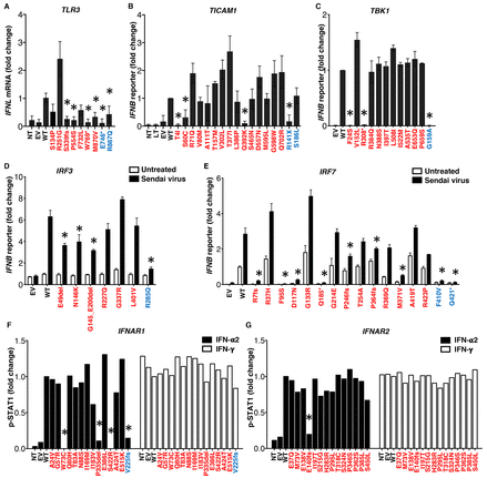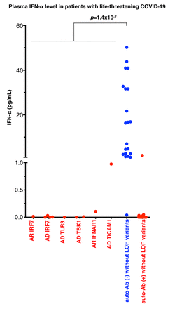 研究者测试了几种基因型是否会在SARS-CoV-2感染过程中削弱I型干扰素的体内产生。测量了COVID-19急性期患者血液中13种类型的IFN-α的水平。在8个基因的LOF突变的23例患者中,没有一例可检测到针对I型IFN的自身Ab抗体。