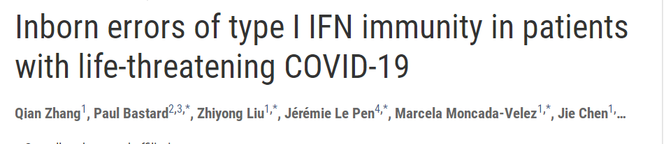 参考文献:Qian Zhang1, Paul Bastard et.al, Inborn errors of type I IFN immunity in patients with life-threatening COVID-19, DOI: 10.1126/science.abd4570