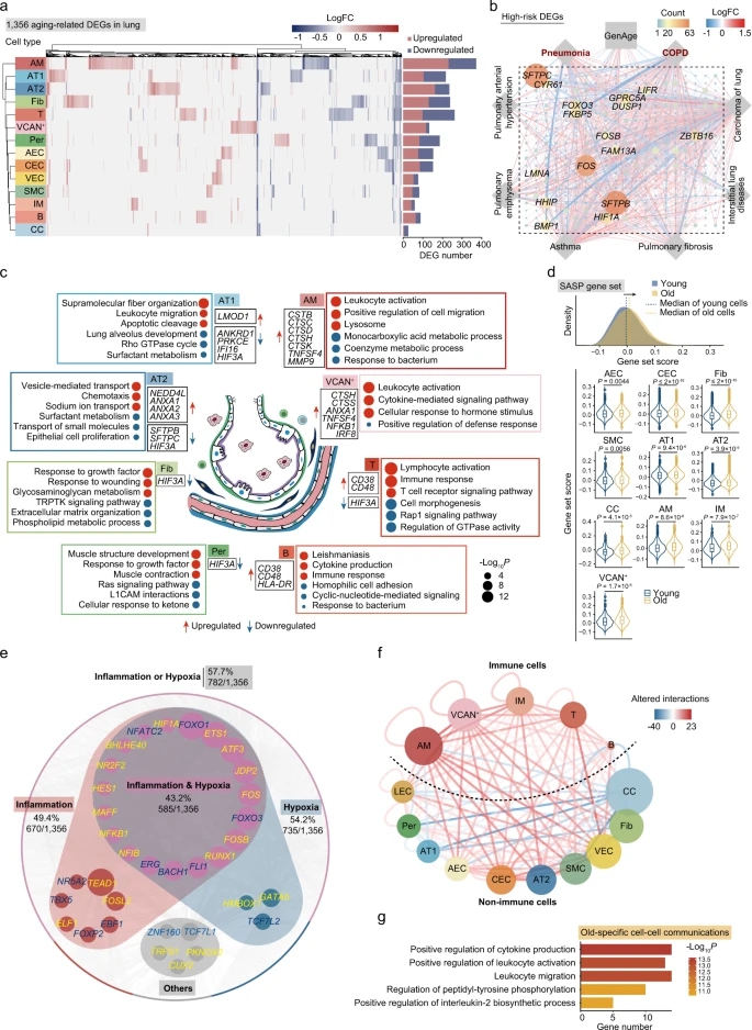 为了阐明在细胞水平上与衰老相关的分子机制,研究人员试图鉴定单个肺细胞中与衰老相关的转录变化。研究发现,与年轻的肺细胞相比,在至少一种类型的老年肺细胞中表达了1356个DEG(| logFoldChange(logFC)| 0.25,调整后的P值<0.05)(图2)。衰老期间受影响最大的细胞类型包括AM,T细胞,成纤维细胞,AT2和AT1,分别具有372、262、239、235和217个DEGs(图2)。