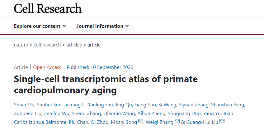 参考文献:Shuai Ma, et.al, Single-cell transcriptomic atlas of primate cardiopulmonary aging, Cell Research (2020) 0:1–18; https://doi.org/10.1038/s41422-020-00412-6