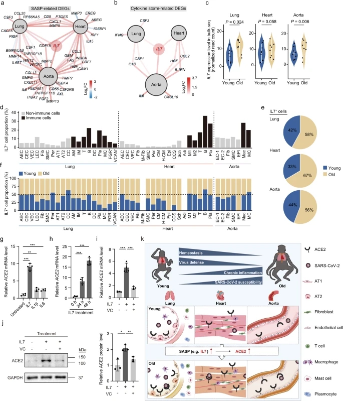 在这项研究中,研究人员分析了老年灵长类动物呼吸道和心血管组织的单核转录组图谱,以了解其易受年龄相关疾病和COVID-19侵害的细胞和分子基础。发现灵长类动物肺部和心血管衰老的关键特征包括受损的组织稳态和病毒防御能力以及激活炎症反应。提出将抗神经保护剂重新用于COVID-19治疗,尤其是对于弱势老年患者,可能是一种预防/治疗策略。以及阻断IL7信号传导可能有助于降低全身或局部ACE2水平并缓解SARS-CoV-2症状,为测试抗IL7抗体或IL7阻断剂作为重度COVID-19高龄患者的治疗方法提供了科学依据。