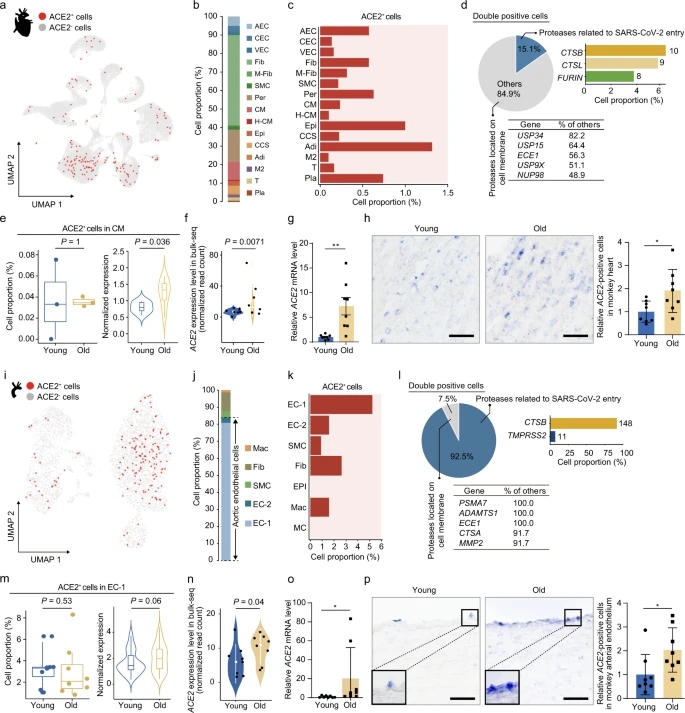 通过大量RNA测序(RNA-seq),定量实时PCR(RT-qPCR),RNA-ISH和ACE2抗体免疫染色,发现老年心脏中ACE2转录和蛋白质水平增加(图3),老年灵长类脉管系统中ACE2表达的上调,可能与老年动脉对冠状病毒感染的敏感性增加有关。
