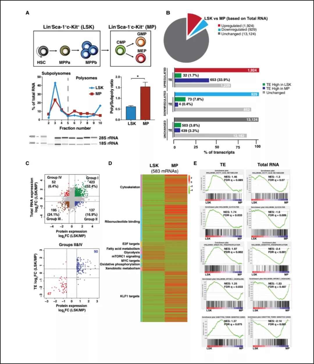 研究人员对野生型成年小鼠中纯化的富含HSCs的LSK(Lin Sca-1 + c-kit +)细胞和荧光祖细胞(MP; Lin Sca-1c-Kit +)进行了荧光激活细胞分选 (FACS)并进行多核糖体分析。 结果表明,MPs比LSK细胞含有多20%的多核糖体RNA,这与其高水平的整体翻译一致。RNA测序(RNA-seq)数据表明,LSK和MP细胞不仅表达不同的转录组,而且翻译介导与其独特发育状态一致的生物学功能的特定mRNA(图1);尽管与MP相比,LSK的整体翻译减少了,但LSK的翻译转录比例要比MP更高。LSK细胞优先翻译参与维持HSC的多个关键途径的mRNA。 而TE可以更好地预测LSK和MP细胞中总RNA和蛋白质表达变化不相关的那些mRNA的蛋白质表达变化。这些发现强调了早期胚胎发育中翻译调控的重要性。