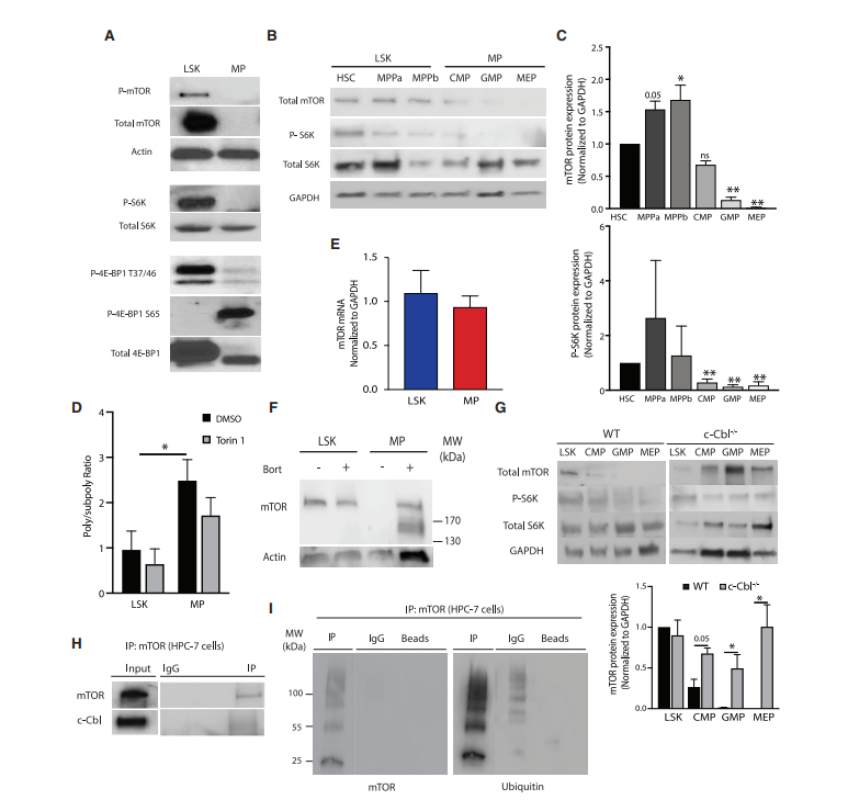 研究人员评估了LSK和MP细胞中的mTOR信号传导,出乎意料的是,尽管mTOR蛋白存在于更成熟的谱系阳性(Lin +)细胞中,但与LSK相比,MPs中的mTOR蛋白显着降低。 为了确定mTOR降解的潜在介体,查询了蛋白质组学数据以预测高度靶向mTOR的泛素连接酶的表达,由于MP细胞蛋白质组学数据中缺乏可检测的Mdm2蛋白,因此将重点放在c-Cbl上,与LSK细胞相比,所有MP亚群中c-Cbl的表达增加,数据表明,mTOR通过cCbl介导的机制在MP细胞中泛素化并降解。
