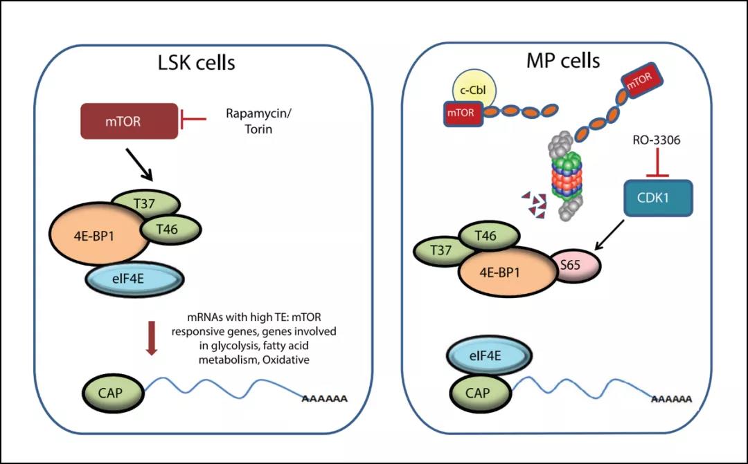 MP细胞尽管mTOR表达显着降低,但与LSK细胞相比却显示出整体翻译增加,因此研究人员查询了先前报道的候选激酶的蛋白质组学数据,该候选激酶显示可将Ser-65上的4E-BP1磷酸化以激活翻译,包括GSK-3,促分裂原激活蛋白激酶(MAPK)p38,PIM2和LRRK2,这些蛋白均未在MP细胞中显着表达(图3)。数据表明MP细胞以CDK1依赖性方式磷酸化4E-BP1 Ser-65,以激活eIF4E依赖性翻译并维持其正常功能。