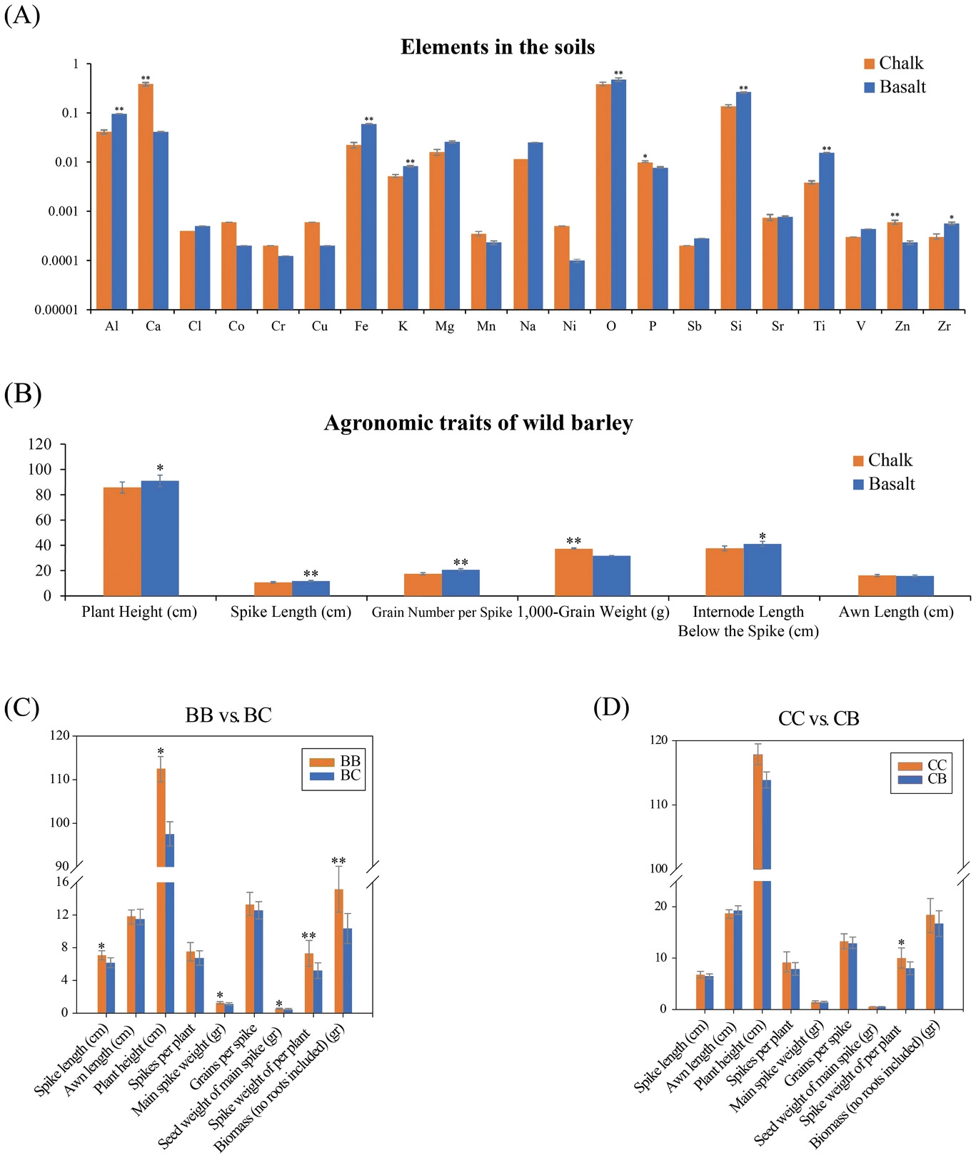 该研究发现,两个生长在物理距离紧邻但不同土壤微环境的大麦群体在形态和农艺性状上已经发生显著分化,并且它们在自然环境中都比在国外环境中表现出更好的适应性,显示它们间发生了遗传适应性分化,这从形态和农艺性状的角度为微观地理适应提供了证据。进一步研究发现土壤成分在塑造两个相邻的野生大麦种群的遗传差异中起着关键作用,土壤生态差异是造成这两个群体分化的主要驱动因子。此外还发现两个不同种群中的植物发展了应对土壤胁迫的有效适应机制,发掘鉴定到了一系列具有重要功能的适应性基因,发现适应性基因HORVU4Hr1G056890通过调控大麦的根型来适应火山岩(Basalt)和石灰岩(Chalk)两种不同土壤,是野生大麦对土壤微环境适应性进化的重要适应基因。