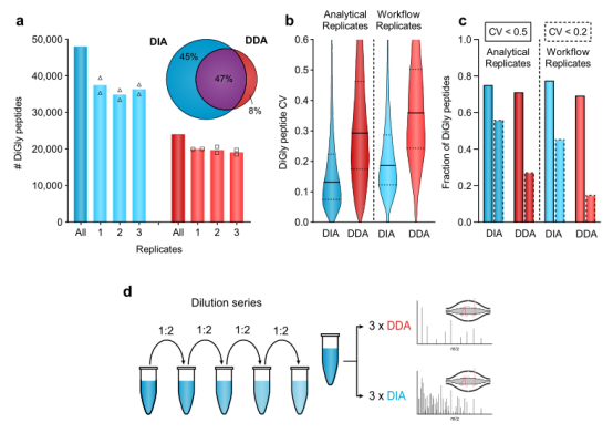 图2 用于DIA定量的准确且可重复的diGly蛋白质组学。(a)用于DIA(蓝色,HEK293混合库)和DDA(红色)策略(n=6,三个工作流程重复)的已识别diGly肽的数量(平均值,n=2); (b) 变异系数值分布的直径和数据分析方法。实线和虚线分别表示中位数和第一或第三分位数; (c) CV值低于50%和20%的分数分别用实线和虚线表示; (d) diGly富集样品的稀释系列。