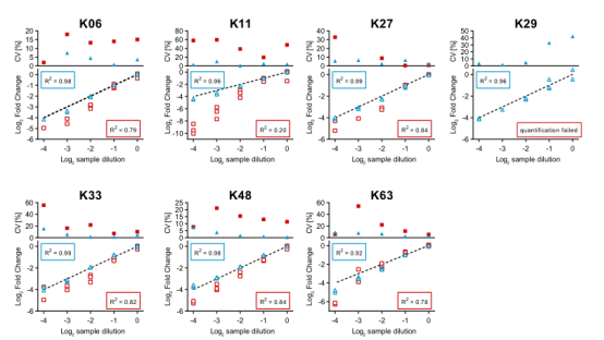 使用DIA和DDA方法分别对diGly样品(泛素链连接衍生的diGly肽)进行分析,进一步确认以上方法的定量精准度和准确性。结果表明,DIA方法评估的所有七种链肽的R2值高于0.92,远高于DDA的相应值(R2 0.20–0.84),如图2d所示,量化结果也显示了DIA斜率比DDA更接近1。这些结果证明了DIA方法比DDA能够识别更多diGly肽的数量,同时显著地提高了量化的精准度和准确性