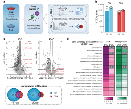 对TNF(肿瘤坏死因子)刺激的U2OS细胞中超过10,000个diGly位点进行量化,结果表明,DIA和DDA两种方法量化的泛素化位点数量相近(DIA中10,300个,DDA实验中9500个,图3b)。然而,DIA实验得到248个显著上调泛素化位点(5%FDR,中值折叠变化2.5),其中37个定位于已知参与TNF/NFκB信号传导的23种蛋白质(图3c),但DDA方法仅鉴定出38个显著上调的泛素化位点(5%的FDR,中值折叠变化4.1),其中15个定位于7个TNF/NFκB信号蛋白。