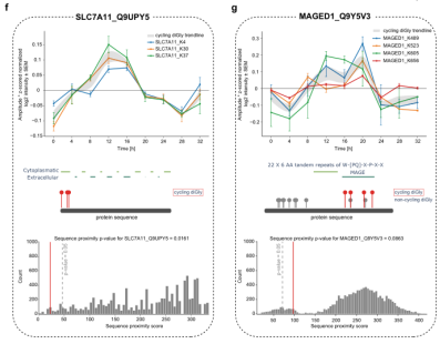 结果显示,获得的10,886个泛素化位点对应于3238种蛋白质(图4b),而蛋白质组中共有7590种蛋白质被定量,其中最多有143种蛋白质发生了振荡(q值< 0.33)。此外,周期性分析表明,18%的蛋白质上8%的泛素化位点以昼夜节律方式振荡(图4c);过表达分析显示,被注释为膜蛋白(59%)的蛋白质主要参与小分子的运输,如离子、胺和有机酸(图4d),有四分之一的节律性泛素化蛋白质包含一个以上的振荡位点(150个位点;图4e)。研究还发现了一些相邻位点大多位于具有潜在调节功能的区域,如不依赖胱氨酸-谷氨酸钠转运体(SLC7A11,501 AA)的K4、K30和K37有节奏地泛素化且具有相似的阶段(分别为13.8、13.3、13.1 h,图4f)。另外,在MAGED1的MAGE结构域中发现了新的振荡泛素化修饰(MAGE D1是一种直接与核心时钟蛋白RORα相互作用的蛋白质,用于调节Bmal1、Rev-erbα和E4bp4基因表达(图4g)),研究结果确定了MAGED1的活性可以通过其MAGE结构域中的多重泛素化以翻译后的方式有节奏地控制。