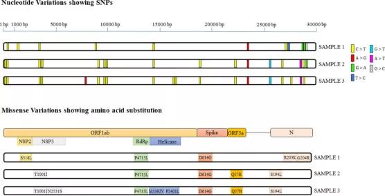 从3个鼻咽拭子中提取的SARS-CoV-2 RNA经RT-PCR检测呈阳性,被转化为cDNA并进行NGS处理,分析检索了三个样本的全基因组序列。这三个分离株与参考基因组Wuhan-Hu-1的比对显示了在所有样本中SNPs的普遍性(图2)。样本1、2和3分别显示了11、16和19个SNPs。分离株共发现27个变异,其中4个为所有人共有变异,11个为样本2和3独有变异。在所有三个分离株中观察到的四种常见的突变都是c.241C>T,c.3037C>T,c.14408C>T和c.23403A>G。研究共发现了9个属于最常见突变类型的突变,其中6个(c.241C>T,c.3037C>T,c.14408C>T,c.23403A>G,c.25563G>T和c.28881G>A)在所有大洲都很常见,c.26735C>T和C.28854C>T是针对亚洲分离株的,C.18877C>T在美国和亚洲的分离株中均有发现。由于这些点突变而导致的氨基酸替换如图2的下面板所示。在27个突变中,有25个突变位于编码区,它们产生了14个同义氨基酸替换和11个错义氨基酸替换。这11个错义突变中有3个可能具有很高的影响,因为它们以带电荷替代不带电荷的氨基酸,或者反之亦然,因此可能会影响蛋白质的结构和功能,包括刺突糖蛋白中的p.D614G,ORF3a中的p.Q57H,和核衣壳中的p.G204R。