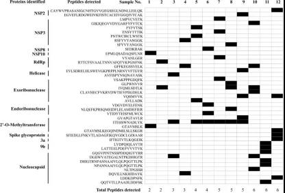 图3 SARS-CoV-2的临床蛋白质组学。肽图为从12名COVID-19患者的临床鼻咽拭子中鉴定的SARS-CoV-2肽段;以黑色突出显示的单元格代表该样本中检测到的肽;肽的序列以及匹配的蛋白质列在左侧;样品鉴定的总肽显示在底部;样品编号1-12按检测到的总肽的升序排列。