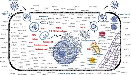 图5 SARS-CoV-2 和宿主细胞蛋白质组概述。该图描绘了研究中鉴定的SARS-CoV-2和宿主上皮细胞蛋白质组。在囊泡内化后,冠状病毒RNA会经历一系列复制并转化为病毒蛋白。病毒蛋白以红色文本表示,阳性样本中鉴定的宿主蛋白以黑色显示。像刺突糖蛋白这样的病毒结构蛋白通过ER进行折叠和运输。单独组装在细胞质中的核衣壳形式(RNA和N蛋白)进一步与ER-Golgi中间隔室中的结构蛋白结合,形成完整的病毒粒子,组装的病毒粒子通过胞吐作用离开受感染的细胞并继续传播。