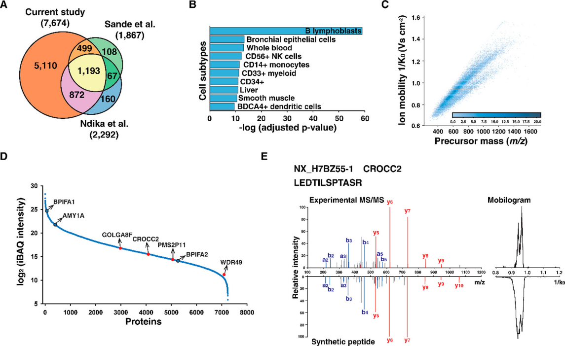 图3 鼻咽蛋白质组目录的生成。(A)鼻咽蛋白质组与之前NP拭子样本的蛋白质组学研究的比较。(B)PASEF-DDA 实验中细胞蛋白质亚型的鉴定。(C)谱库中包含的102392种肽段的前体质量密度分布和离子迁移率。(D)已鉴定蛋白质的iBAQ强度分布。鼻咽中表达的蛋白质标记为黑色,缺失的蛋白质标记为红色。(E)缺失蛋白CROCC2的实验和合成肽LEDTILSPTASR的MS/MS光谱和动态图。
