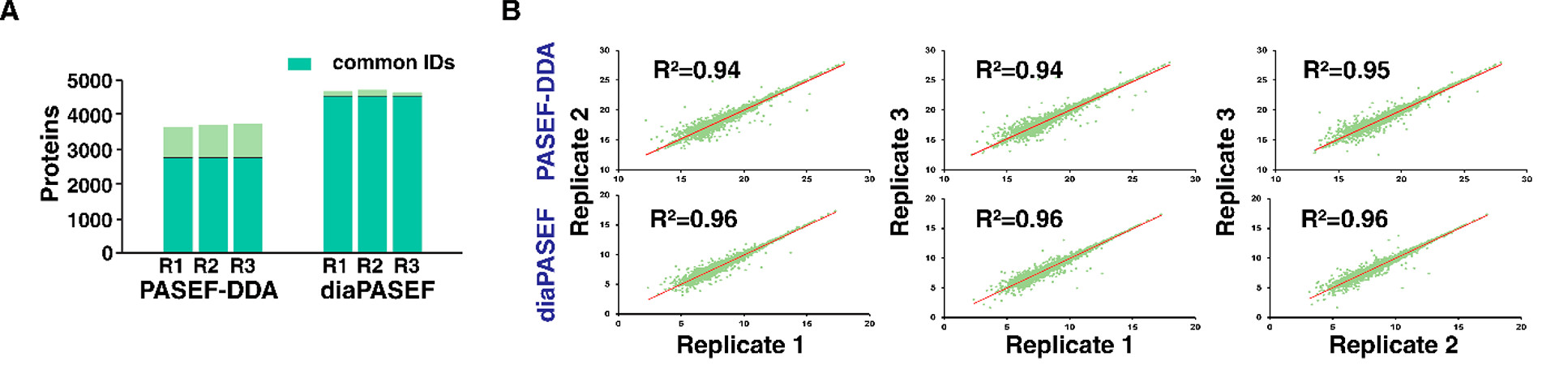 图2 (A) PASEF-DDA和diaPASEF三次实验中蛋白质组数量的条形图;(B) PASEF-DDA和diaPASEF三次实验的蛋白质丰度相关性。