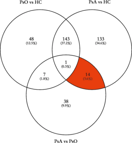 图2 维恩图描绘了三个蛋白质组显著表达的蛋白质的重叠(PsO组与HC组、PsA组与HC组、PsA组与PsO组)。红色部分为符合标准的14种蛋白质(SIRT2、NAA50、ARF6、ADPRHL2、SF3B6、SH3KBP1、UBA3、SCP2、RPS5、NUDT5、NCBP1、SYNE1、NDUFB7、HTATSF1):(1) 在“ PsA 与 HC”和“PsA 与 PsO”;(2) 不在“PsO与HC”部分。