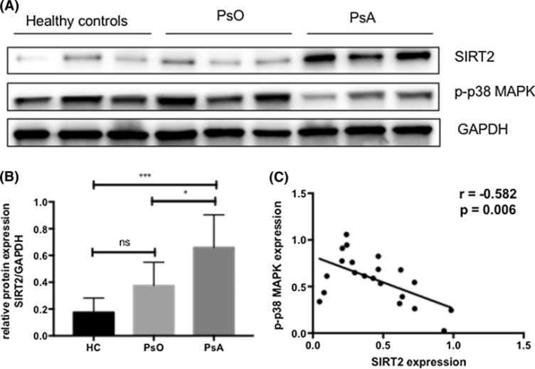 为进一步研究SIRT2在PsA和PsO患者PBMC中的表达,作者通过蛋白质印迹比较了8名PsO患者、8名PsA患者和5名健康对照的SIRT2水平和p38丝裂原活化蛋白激酶(p-p38MAPK)的磷酸化。代表性结果如图5A所示。如图5B所示,与PsO (p = 0.024)和健康对照(p = 0.001)相比,PsA中的SIRT2表达显著更高。此外,SIRT2的表达与 p38MAPK的磷酸化呈负相关(p=0.006,r=-0.582;图5C)。显示PsA患者PBMC中SIRT2的表达显著高于PsO患者和健康对照,SIRT2是sirtuin蛋白家族的成员,主要位于细胞质中,也可以穿梭到细胞核,与关节炎炎症有关。