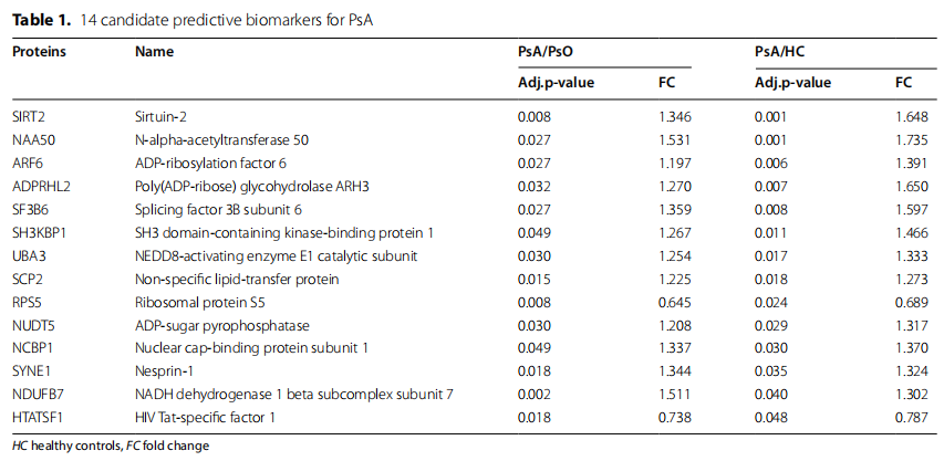 基于iTRAQ的LC-MS/MS共鉴定了22734种肽和3177种蛋白质(FDR<1%)。在进行差异蛋白表达分析后,我们在比较8名银屑病患者(PsO和PsA)和 4 名健康对照(HC)时发现了389种显著变化的蛋白质。同样,我们在比较PsO和HC、PsA和HC以及PsA和PsO时分别发现199、291和60种蛋白质发生了显著变化。通过图2三个显著变化的蛋白质组集的维恩图,符合以下标准的14种蛋白质用红色标记:(1)在“PsA vs. HC”或“PsA vs. PsO”的重叠部分;(2)不在“PsO vs. HC”部分。包括SIRT2、NAA50、ARF6、ADPRHL2、SF3B6、SH3KBP1、UBA3、SCP2、RPS5、NUDT5、NCBP1、SYNE1、NDUFB7、HTATSF1(表1),它们中的大多数在PsA中上调(FC>1),而RPS5和HTATSF下调(FC>1)。