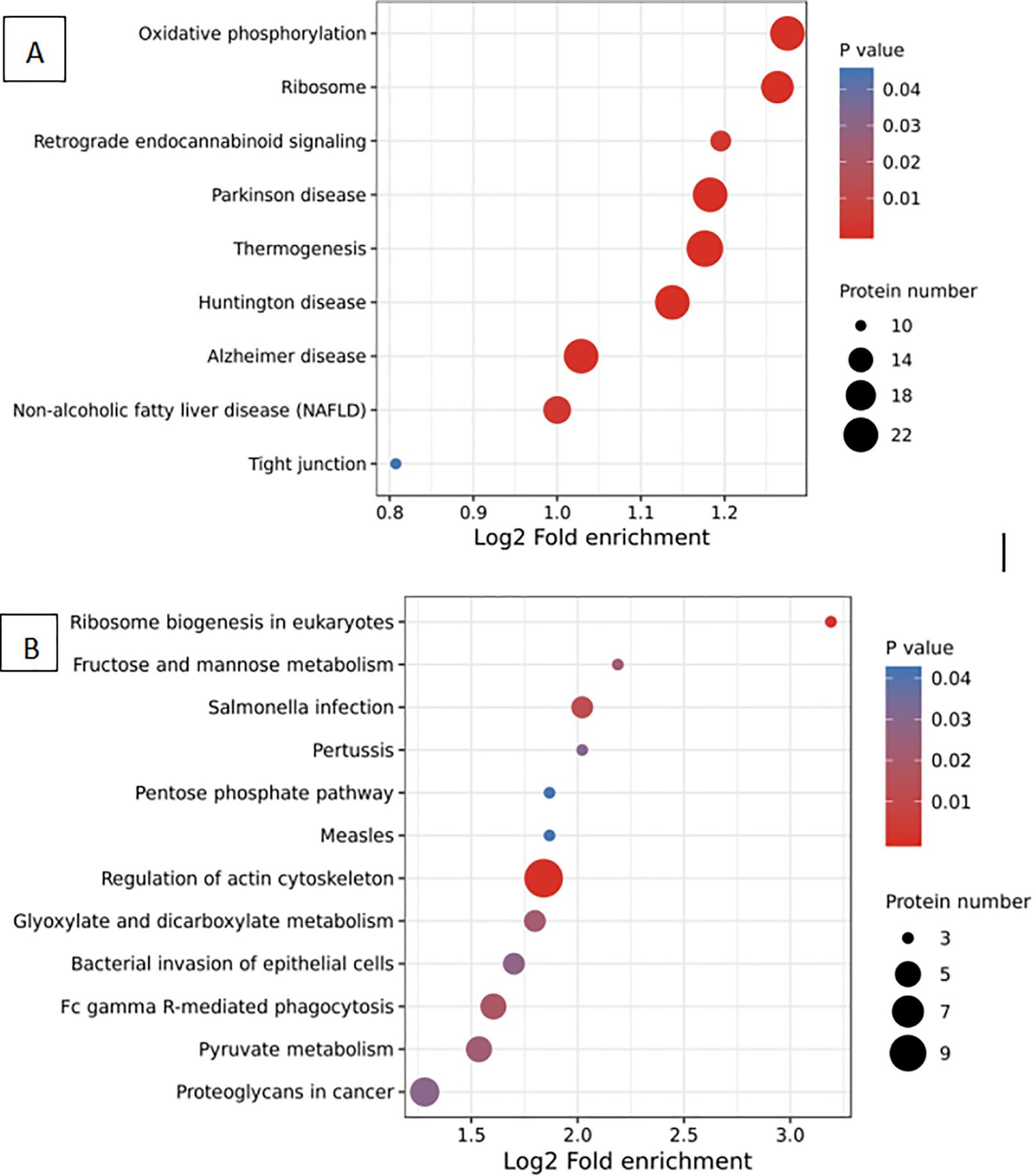 图3 EG-B10中上调蛋白(A)和下调蛋白(B)的KEGG通路富集分析。X轴为功能类型中差异蛋白与鉴定蛋白变化倍数之比的Log2换算值,Y轴是KEGG通路,彩色圆圈表示富集的P值,它们的大小表示通路中差异蛋白的数量。