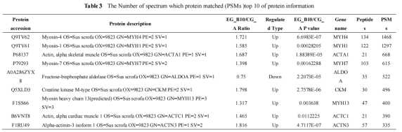 文章进一步分析了EG-B10中前10个PSM的DAPs(表3)。分析表明,8种肌肉相关蛋白(MYH4、MYH1、ACTA1、MYH7、MYH13、ACTC1、ACTN3和ACTB)在EG-B10中上调。这些蛋白质是肌原纤维蛋白的重要组成部分,负责骨骼肌的结构完整性,并参与肌肉收缩。分析还表明,肌球蛋白的肌肉亚型在EG-B10和CG-A样品中存在显著差异,这可能与丙三醇介导的EG-B10里脊肉腌制过程中盐含量的降低直接相关。以往的研究报道MYH1是一种重要的结构蛋白,可以影响肌肉功能,被认为是牛肉嫩度的潜在生物标志物。在此研究中EG-B10的水分和盐分含量低于CG-A,其肉质也存在差异,表明丙三醇引起的DAPs可能在介导腌制过程中发挥作用,导致各种生物事件的变化。此外,在EG-B10中显著上调的其他肌肉质量相关的DAPs中,包括结蛋白(DES)、α-肌动蛋白2亚型(ACTN2)和热休克蛋白家族(HSPB1和HSP90AA1),以及下调的DAPs中,包括肌钙蛋白I (TNNI2)和肌钙蛋白T (TNNT3),结蛋白、肌钙蛋白和肌动蛋白是细胞骨架的重要组成部分,有报道称,这些蛋白质可以作为判断肉类品质的标志物,如嫩度和保水性。此外,一些研究表明,肌钙蛋白可能参与了干腌火腿典型风味的形成,在此研究中,与CG-A相比,EG-B10中肌钙蛋白的表达水平下调,表明丙三醇介导的腌制可能影响火腿风味的形成。