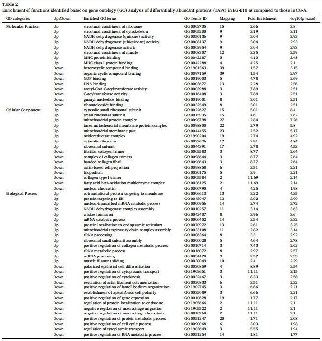 在这项研究中,提出了一种新的固化方法,即低盐丙三醇介导的固化。比较了EG-B10和 CG-A样品的蛋白质组学特征,研究内在蛋白质在固化过程中的作用机制。基于TMT的定量蛋白质组学分析共鉴定出301个DAPs,分布在细胞质、细胞核和线粒体中。DAPs的生物信息学分析进一步表明EG-B10中产热、氧化磷酸化和一些疾病相关通路显著上调,而肌动蛋白细胞骨架的调节通路显著下调。ACTN2、 DES和热休克蛋白(HSPB1和HSP90AA1)可能是引起肉质变化的主要蛋白。这项研究提供了腌制肉制品分子水平的更多信息,证明丙三醇介导的腌制可以提高腌制肉制品的质量,是生产低钠腌制肉制品的有效方法。
