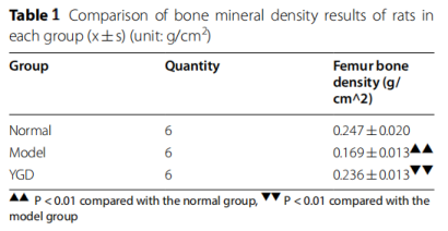为了探索YGD减轻OP的能力,作者首先构建了OP的大鼠模型并测量了骨密度。结果显示,模型组骨密度值明显低于正常组,说明OP大鼠模型建立成功。与模型组相比,YGD组骨矿物质密度(BMD)显著增加(表1)。同时观察了大鼠右股骨的病理组织形态,与正常组相比,模型组骨小梁可见面积变小,宽度变窄,皮质变薄,数量减少,形态结构不规则,排列紊乱,骨髓扩张。YGD给药3个月后,YGD组大鼠与正常组相似,骨小梁稍细,形态规则,排列有序,局部间隙稍扩大(图1)。