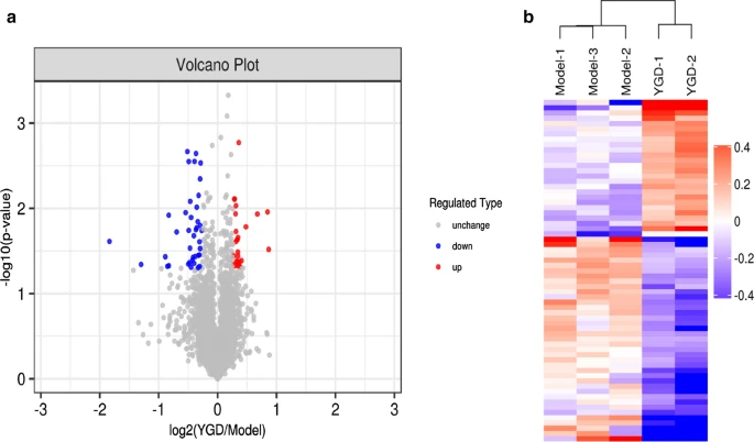 图3 YGD处理后差异表达蛋白的TMT定量蛋白质组学分析。(a) 火山图;(b) 层次聚类结果的树型热图。