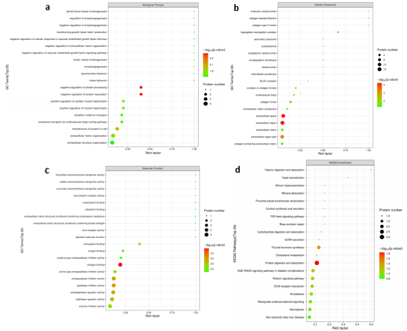 通过GO和KEGG分析YGD处理后差异表达蛋白的生物学功能。GO功能富集分析共获得1656个GO terms,包括1195个生物过程(BP)、218个细胞成分(CC)和243个分子功能(MF)。前20个功能富集如图4a-c所示,在与OP相关的生物过程中观察到显著差异,例如蛋白质调节和肌肉调节,酶调节的分子功能以及定位蛋白胶原三聚体。KEGG通路富集分析发现93个信号通路发生了显著变化,主要涉及的信号通路包括蛋白质消化吸收信号、维生素消化吸收信号、甲状腺激素合成(TH信号)和转化生长因子-β(TGF-β)信号通路(图4d)。