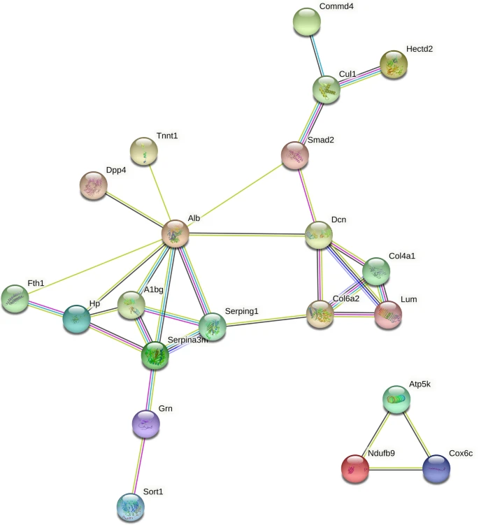 蛋白质发挥作用的一个重要机制是通过与其他蛋白质的相互作用以及通过蛋白质介导的途径或复合物的形成来调节生物过程。根据PPI网络分析,65个差异表达蛋白中共有21个可能直接相互作用,Alb、DCN、Col6a2和Smad2以多种方式参与其中。此外还发现差异表达的蛋白质DPP4也在图中,这是一种与糖尿病密切相关的蛋白质,这种蛋白质也可能参与并影响骨代谢途径(图5)。