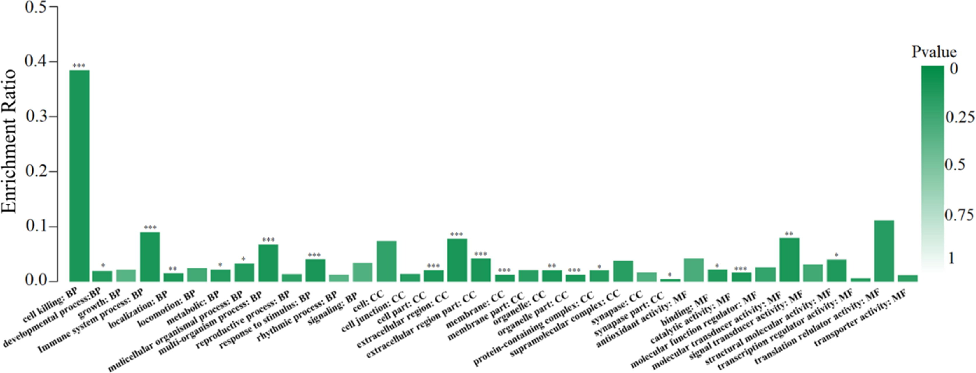 为了检验DEPs在BCL治疗慢性胃炎中的生物学功能,通过GO根据其相关的BPs、MF和CC对DEPs进行分类(图3)。在BP类别中,DEPs在细胞杀伤和免疫系统以及多细胞有机过程中显着富集。在CC类别中,这些DEPs涉及细胞部分、细胞外区域和细胞外区域部分。最后,在MF类别中,DEPs在结合、催化活性和分子转导活性方面显著富集。因此,在BCL治疗慢性胃炎期间,受BCL影响的DEPs可能在基础BP、免疫系统和结合中发挥重要的调节作用。