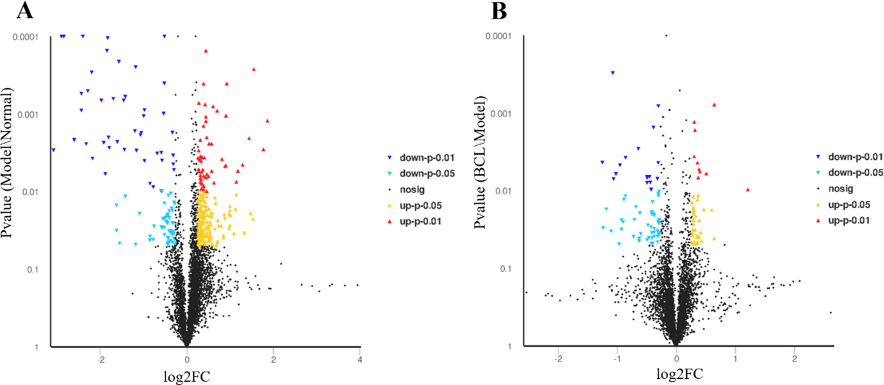 图2 差异表达蛋白质的火山图。(A) 模型组与正常组的火山图;(B) BCL组与模型组的火山图。