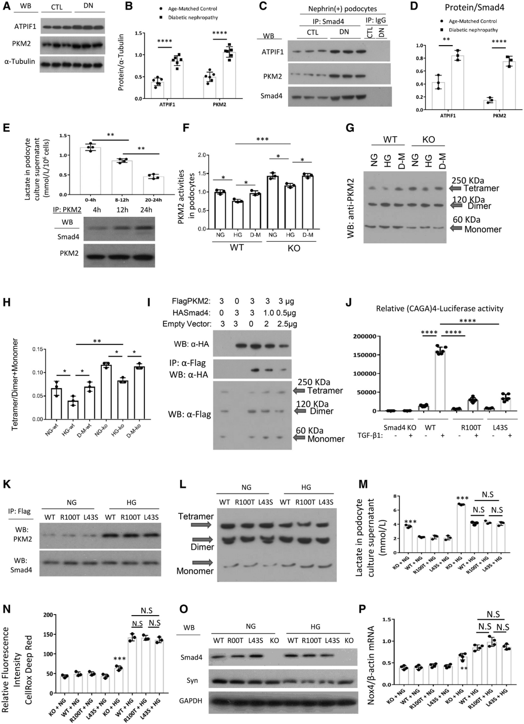 接下来,作者研究了Smad4调节足细胞糖酵解的机制。在分离的足细胞中确定了非糖尿病细胞中Smad4和PKM2之间的结合,并且这种相互作用在糖尿病小鼠的足细胞中增加(图6A-D)。培养的Smad4-/-足细胞在高葡萄糖培养条件下,随着Smad4和PKM2之间的相互作用增加,乳酸产量下降,并且在正常和高葡萄糖条件下均显示出PKM2活性的增加(图6E-F),这表明Smad4可能调节PKM2活性。PKM2的活性形式具有四聚体结构,而二聚体和单体形式是无活性的。交联研究表明,足细胞的高葡萄糖刺激导致 PKM2(四聚体)的活性形式减少,而Smad4缺陷型足细胞在正常和高葡萄糖条件下均表现出更显著的高水平PKM2四聚体(图6G-H)。作者进一步将293T细胞与带有Flag标记的PKM2和HA标记的Smad4表达质粒共转染,并进行了交联研究,证明Smad4与PKM2相互作用抑制了PKM2四聚体的形成(图6I),进一步的免疫沉淀实验证明Smad4对糖酵解的调节不依赖于Smad4核功能(图6J-P)。