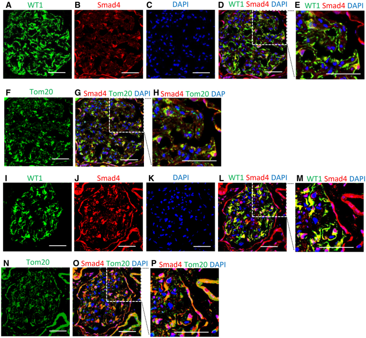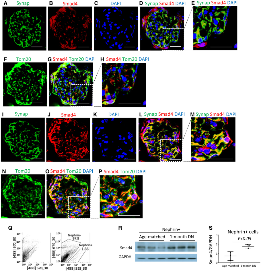 作者检测了人和小鼠DN中足细胞Smad4的表达。共聚焦显微镜显示正常人肾脏中肾小球细胞(包括 WT1+足细胞)中的Smad4染色,Smad4与线粒体标记物Tom20的共定位相对较少(图2A-H)。在糖尿病肾病的肾小球足细胞中Smad4表达明显增加,在一些细胞中Smad4和Tom20的共定位明显(图2I-P)。正常小鼠肾脏的足细胞中Smad4与Tom20几乎没有共定位(图3A-H),然而糖尿病肾脏在肾小球中表现出Smad4的上调,部分Smad4蛋白在一些肾小球细胞(包括足细胞样细胞)中与Tom20共定位显著(图3I-P)。足细胞中Smad4的上调是小鼠DN早期行为,分离的足细胞的蛋白质印迹显示糖尿病4周后Smad4蛋白水平增加(图3Q-S)。这些发现表明Smad4在足细胞代谢中的潜在作用。