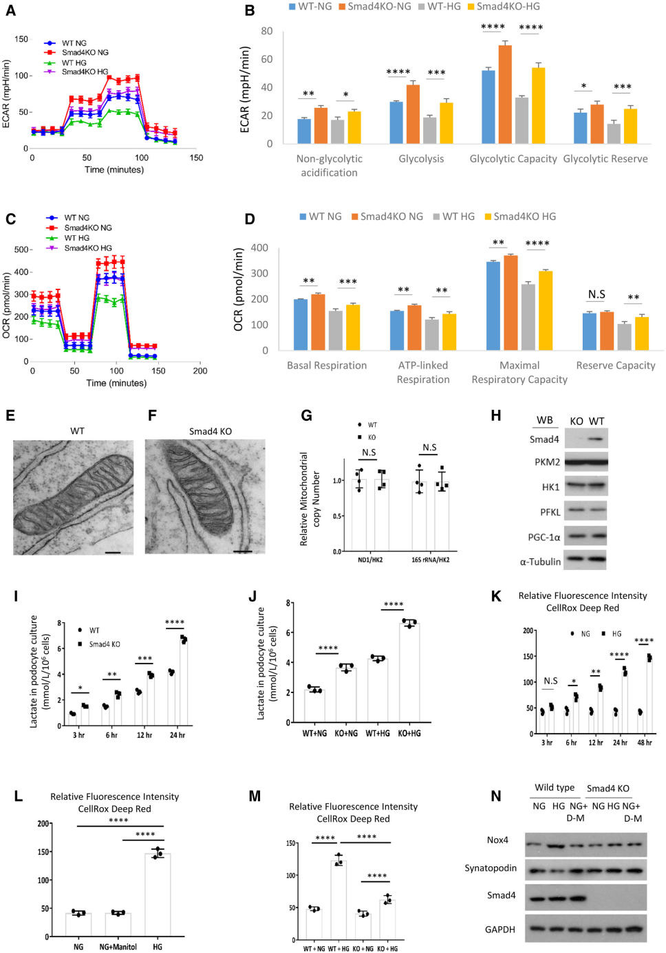 研究证明,糖酵解是足细胞中细胞内ATP产生的主要贡献者,并且磷酸果糖激酶在足细胞足突中表达,这表明糖酵解在正常足细胞功能中的重要作用。作者进一步研究了足细胞中Smad4缺失的保护作用是否与糖酵解有关。Seahorse糖酵解压力测试和海马细胞线粒体压力测试表明Smad4缺乏会增加OXPHOS活性(图5A-D)。Smad4缺乏并没有改变线粒体形态和线粒体拷贝数,也没有改变三种限速糖酵解酶或线粒体生物发生标志物PGC-1α的蛋白水平(图5E-H)。与野生型足细胞相比,缺乏Smad4的足细胞具有更大的乳酸产生能力,并且在正常和高葡萄糖条件下都减少了活性氧(ROS)的产生(图5I-M)。此外,Smad4缺乏阻止了高葡萄糖诱导的NOX4表达上调和突触足蛋白下调(图5N)。NOX4是肾脏中ROS的主要来源,DN和足细胞中的NOX4因高糖反应而增加。足细胞特异性Nox4缺失可保护小鼠免受糖尿病肾病的影响,这种保护与肾脏ROS产生减少有关。因此,Smad4缺失促进糖酵解,调节OXPHOS活性,降低NOX4表达和ROS产生,并防止高糖诱导的足细胞损伤。