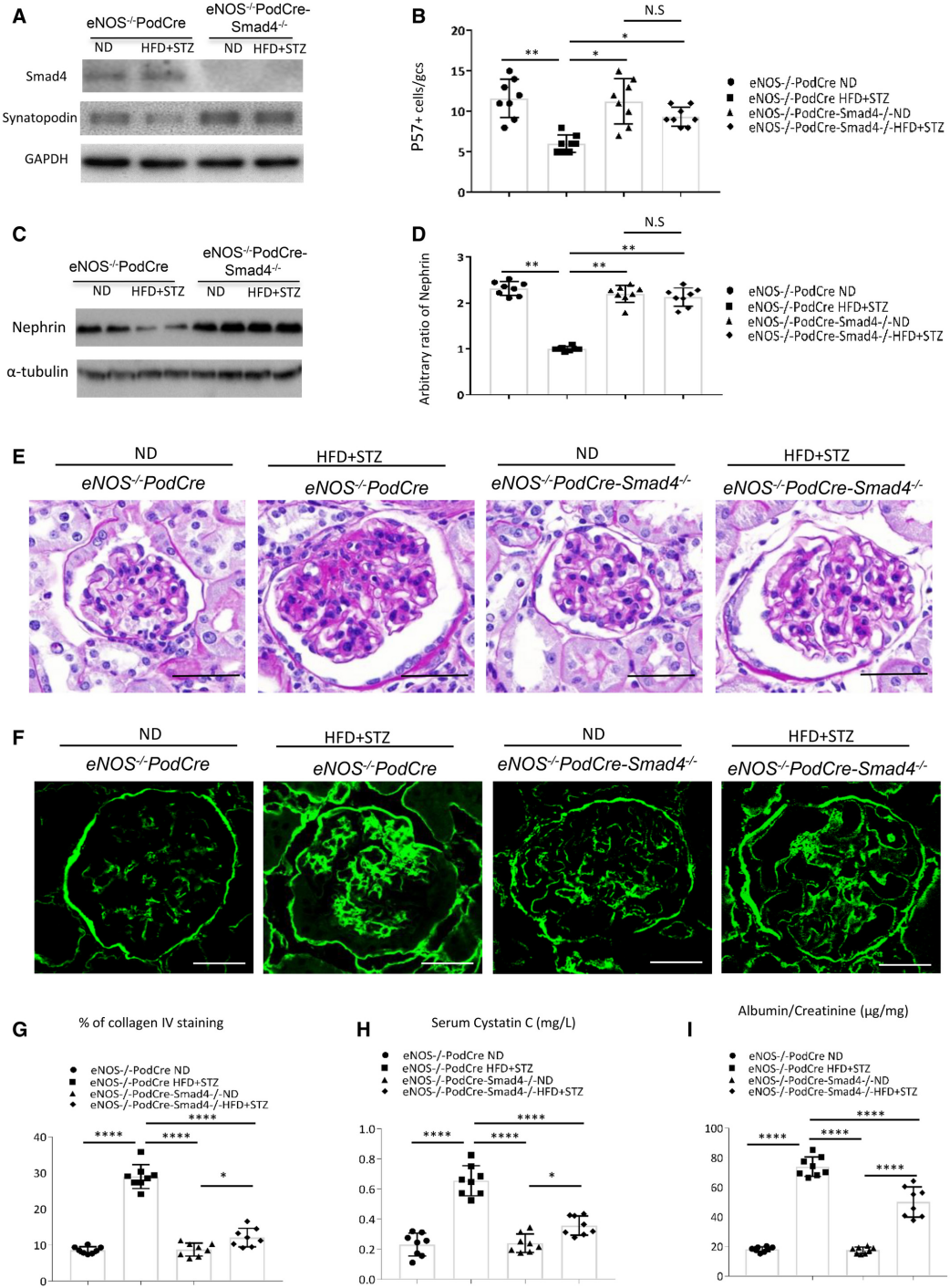 为了明确Smad4是否影响2型DN中足细胞功能的问题,作者在C57BL/6J背景上生成了足细胞中Smad4缺失的eNOS-/-小鼠(eNOS-/-; PodCre-Smad4flox/flox小鼠)。Western印迹分析证实了eNOS-/-小鼠的足细胞中Smad4的有效缺失(图4A)。与对照糖尿病小鼠相比,糖尿病eNOS-/-; PodCre-Smad4-/-小鼠在p57+足细胞丢失和足细胞特异性蛋白nephrin下调方面对足细胞损伤具有显著保护作用(图4B-D)。对照糖尿病小鼠表现出肾小球肥大、系膜基质扩张、肾小球硬化(肾小球IV型胶原蛋白沉积增加)、肾功能下降(血清胱抑素C增加)和白蛋白尿(尿白蛋白/肌酐比值增加)(图4 E-I) 。相比之下,糖尿病eNOS-/-; PodCre-Smad4-/-小鼠显示出对系膜基质扩张和肾小球硬化的显著保护,尽管肾小球肥大仍然很明显(图4E-G)。此外,糖尿病eNOS-/-; PodCre-Smad4-/-小鼠表现出肾功能改善和蛋白尿减少(图4H-I)。尽管糖尿病和肥胖症未改变,足细胞中的Smad4缺乏保留了肾功能并保护小鼠免受肾损伤。