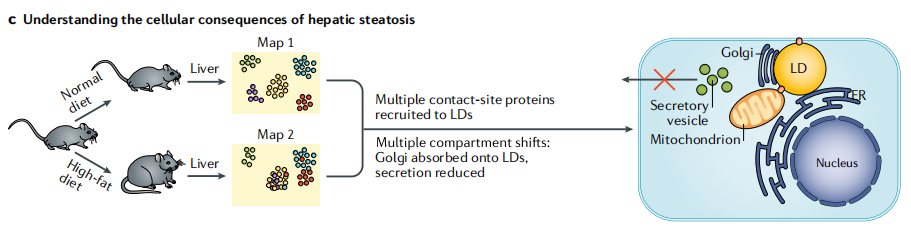 给小鼠喂食正常饮食或高脂肪饮食,以诱导肝脂肪变性,这是非酒精性脂肪肝(NAFLD)的一个标志。生成蛋白质相关谱图来监测肝脏中蛋白质的亚细胞易位。关键的观察结果包括许多接触位点蛋白重新定位到脂滴(LDs),高尔基体在LDs上的吸附和随后的分泌缺陷,这为NAFLD中肝细胞功能的降低提供了潜在的分子机制。