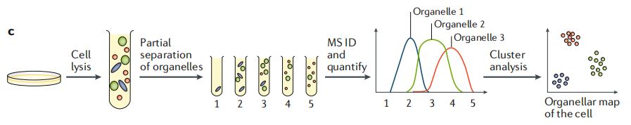图1c为多细胞器分析法的分析流程,应用亚细胞分级方案,同时分离所有的细胞器。由于没有进行细胞器“纯化”,因而细胞器很大程度上重叠分布。之后对亚细胞分级进行定量质谱分析。每个细胞器都有自己独特的蛋白轮廓,通过对蛋白聚类分析,并使用已有的细胞器标记,对聚类蛋白进行注释。最后,标记谱可整理为一个分类算法(如支持向量机或神经网络)来预测非标记蛋白的隔间关联。研究结果是一个详细的细胞器图,可表明定量蛋白的亚细胞定位。