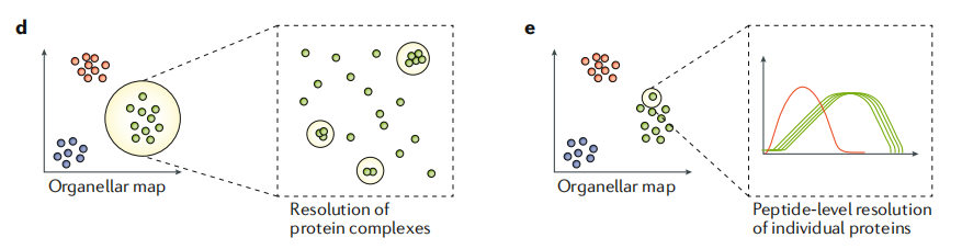 另外值得一提的是,由于质谱的高分辨率,细胞器质谱图本质上提供了大量潜在的相互作用的组学数据。如作为同一复合物的蛋白质在细胞器图谱上显示为微团簇,这一特征可用于鉴定新型蛋白质复合物(图1d)。此外,细胞器图谱原则上可提供肽段水平的分辨率(图1e),并揭示不同的蛋白质剪接体、蛋白水解加工形式,以及与翻译后修饰相关的多种定位差异。随着质谱技术的进一步发展,基于肽水平的细胞器定位可能会为解开蛋白质亚细胞定位的复杂性做出重大贡献。