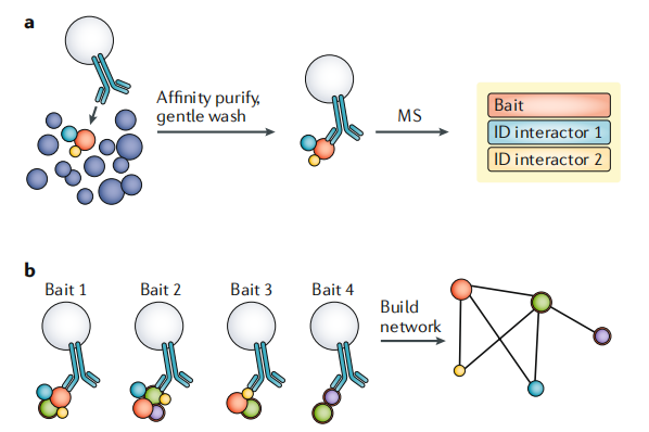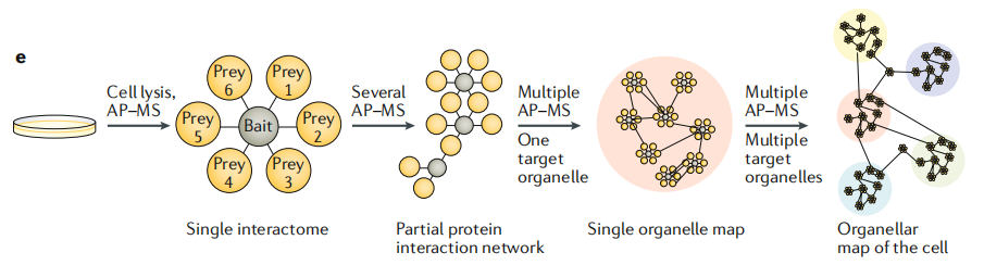 通过抗体介导的亲和纯化-质谱(AP-MS)实验,质谱已被广泛用于定义蛋白质-蛋白质相互作用。使用抗体从复杂样本(如全细胞裂解物)中亲和纯化蛋白质及其结合配体,后续通过MS分析鉴定(图3a)。从概念上讲,由于相互作用的蛋白必须位于相同的亚细胞位置,所以蛋白质的相互作用组可以认为是“局部”的空间蛋白质组。使用相互作用的诱饵蛋白进行多个AP-MS实验,也可以揭示一个具有空间信息的蛋白关联网络(图3b)。