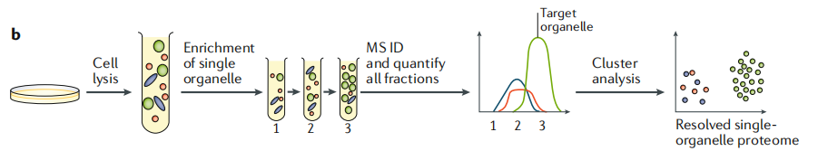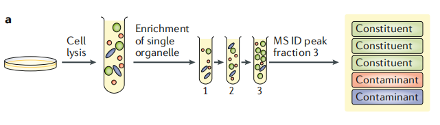 细胞器分析的基本策略是进行量身定制的生化分离,以对特定的细胞器进行富集,然后使用MS对富集方案的不同步骤中的蛋白质进行量化。如图1b所示,利用定量质谱方法对目标馏分和某几个相邻或相近馏分进行检测,每种蛋白质都可获得丰度分布曲线,再通过统计分析区分污染物(红色和蓝色),污染物可被识别,但却不一定能分解为不同的类别。该方法专注于单一的细胞器,通常适合解决有针对性的研究问题。