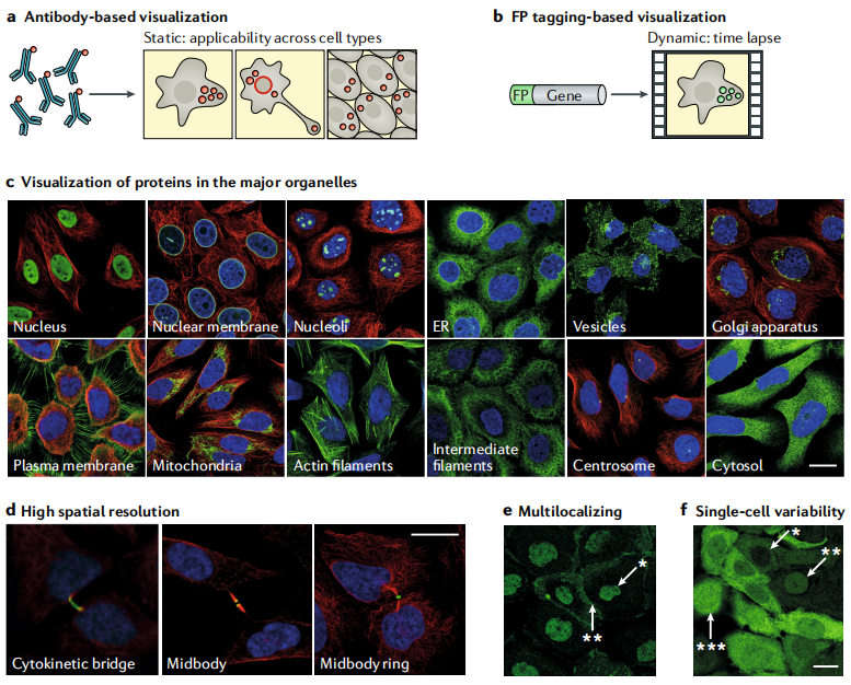 基于成像的空间蛋白质组学提供了在自然细胞环境下可视化研究蛋白质的机会,而不需要在蛋白质组学分析之前进行细胞裂解或细胞器的分离(图4)。 基于成像的蛋白质定位便于研究具有多模式细胞器定位的蛋白质研究,实际上大多数的蛋白质也是定位于多个亚细胞区室的。此外,越来越多的研究表明,遗传背景相同的细胞群体也会在蛋白表达水平、蛋白定位上表现为差异。基于成像的空间蛋白质组学技术有助于通过捕获单细胞分辨率下的蛋白空间分布来研究这种可变性。蛋白质的可视化成像,通常使用抗体,或荧光蛋白的融合表达来实现。