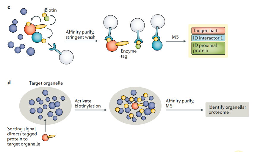 邻近标记法对于细胞器的AP-MS十分有帮助。诱饵蛋白可以使用人工合成的抗坏血酸过氧化物酶(APEX)或生物素连接酶(BioID)进行标记。生物素连接酶可以催化诱饵蛋白紧邻(<10-20nm)蛋白质的生物素化。因而质谱分析的靶标蛋白不仅包括诱饵蛋白、与诱饵蛋白直接结合的配体,还包括瞬时相互作用的蛋白,以及位置紧密相连但不直接结合的蛋白(图3c)。由于少量诱饵蛋白便可获取丰富的空间信息,因而此方法可以在不需要亚细胞分级的情况下获得全面的区室蛋白质组(图3d)。