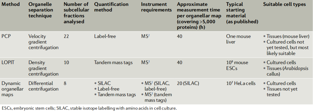 目前基于多细胞器分析的质谱方法,在细胞器分离方法、质谱定量策略,以及生物信息分析方法上,衍生出多种技术改进方案。不论何种方案,过去3年发表的多细胞器分析的应用中,都实现了非常高水平的细胞器分辨率(≥10个亚细胞区室)、蛋白质组学覆盖率(> 5000个蛋白质),以及分类的准确率(通常> 90%)(表 1)。