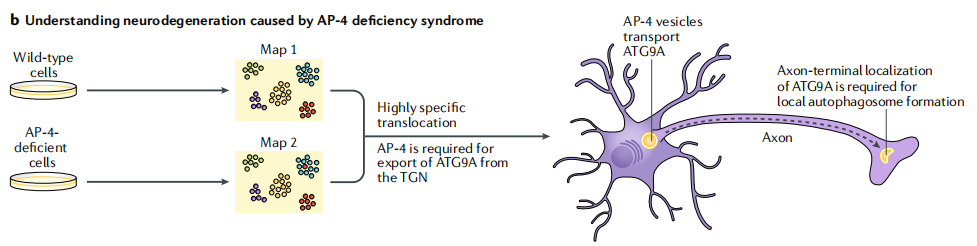 编码AP-4亚基的基因突变会通过一种未知的机制导致严重的智力残疾、轴突变性和痉挛性截瘫。动态细胞器图谱的应用显示,在AP-4缺陷的细胞中,关键的自噬蛋白ATG9A被特异性地保留在反式高尔基网络(TGN)中。该疾病的一种新模型是,在神经元中,AP-4介导ATG9A从TGN到远端轴突的选择性运输,以调节局部自噬小体的形成,这对神经元内稳态至关重要。