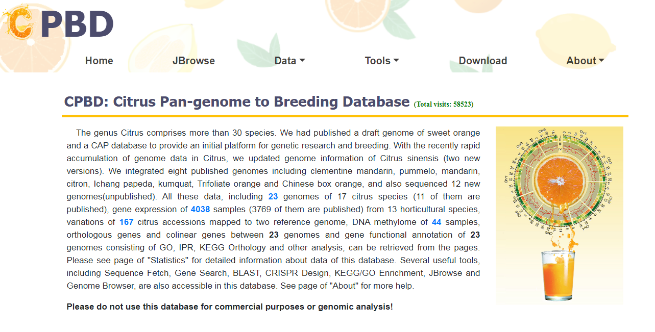 Liu H, Wang X, Liu S, Huang Y, Guo YX, Xie WZ, Liu H, Tahir Ul Qamar M, Xu Q, Chen LL. Citrus Pan-Genome to Breeding Database (CPBD): A comprehensive genome database for citrus breeding. Mol Plant. 2022 Oct 3;15(10):1503-1505.