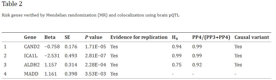 MR通过脑pQTL进一步证实这些生物标志物(ICA1L、CAND2、ALDH2和MADD)是揭示与腔隙性卒中GWAS相关的有力证据(表2)。
