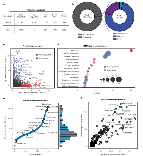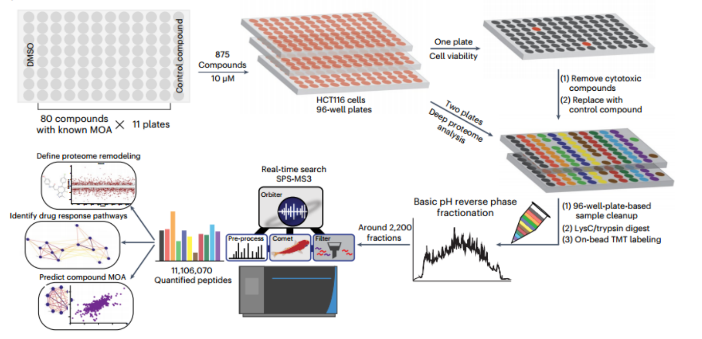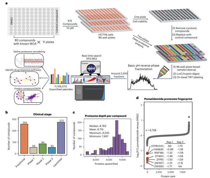 将875个小分子以三个生物重复的形式转移到96孔板的HCT116细胞,将细胞与筛选化合物(10µM)、二甲亚砜(DMSO)或阳性对照化合物孵化,后进行裂解、胰蛋白酶消化和TMT 试剂标记;使用一个复制板筛选有毒化合物,将其移除,并用阳性对照化合物的其他重复进行替换,有毒化合物将以较低浓度重新筛选,并实施单独实验,后进行蛋白质组分析。